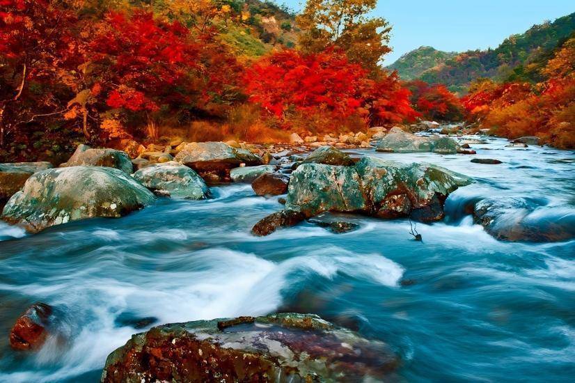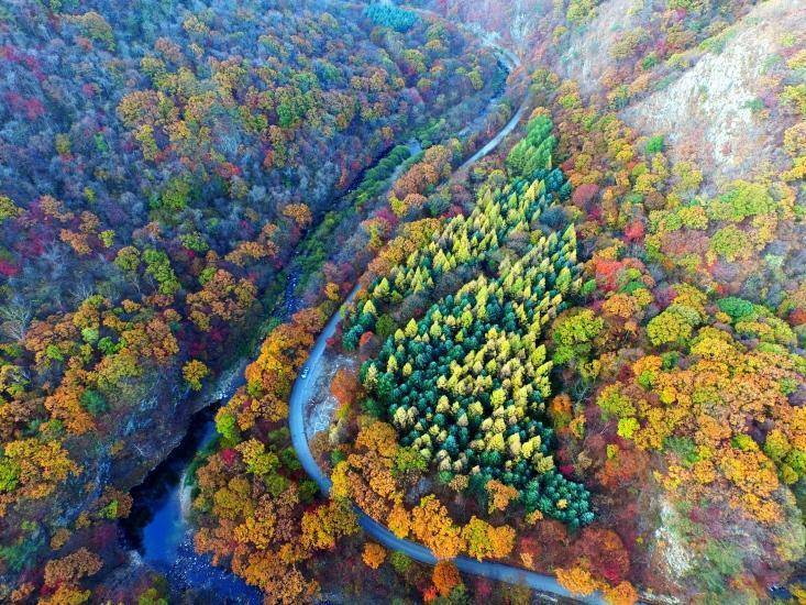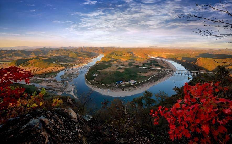 天桥沟的万亩枫林褪去翠绿,泼洒出艳红、橙黄的热烈色彩,漫山遍野的绚烂仿佛点燃了整个山谷,每一步都踏入童话般的梦境。蒲石河蜿蜒穿梭于山林间,澄澈的河水倒映着两岸层林尽染的景致,偶有落叶随波轻漂,为这份静谧增添了几分灵动的诗意。鸭绿江断桥静静矗立在江畔,锈迹斑斑的钢铁骨架诉说着岁月的峥嵘。