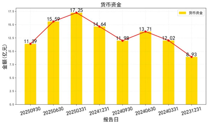 首先,货币资金从年初的14.64亿,降到三季度末的11.39亿,减少了3个多亿。现金储备在消耗。