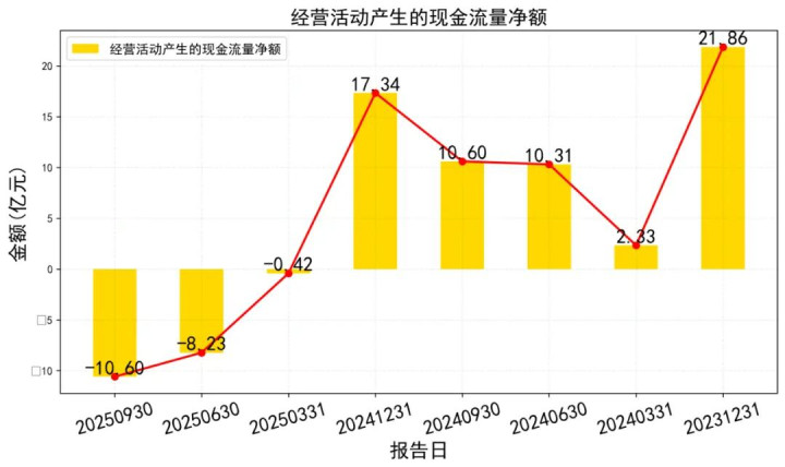 一个更值得警惕的信号出现了:经营活动产生的现金流量净额,前三季度是负的10.6亿!